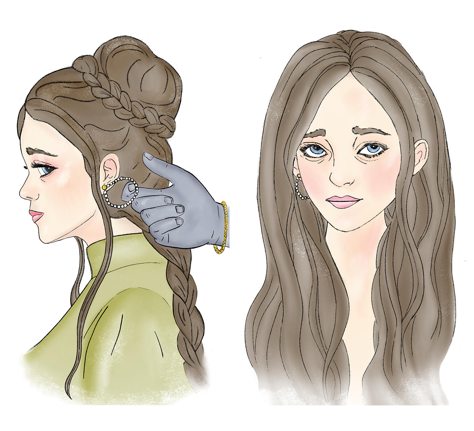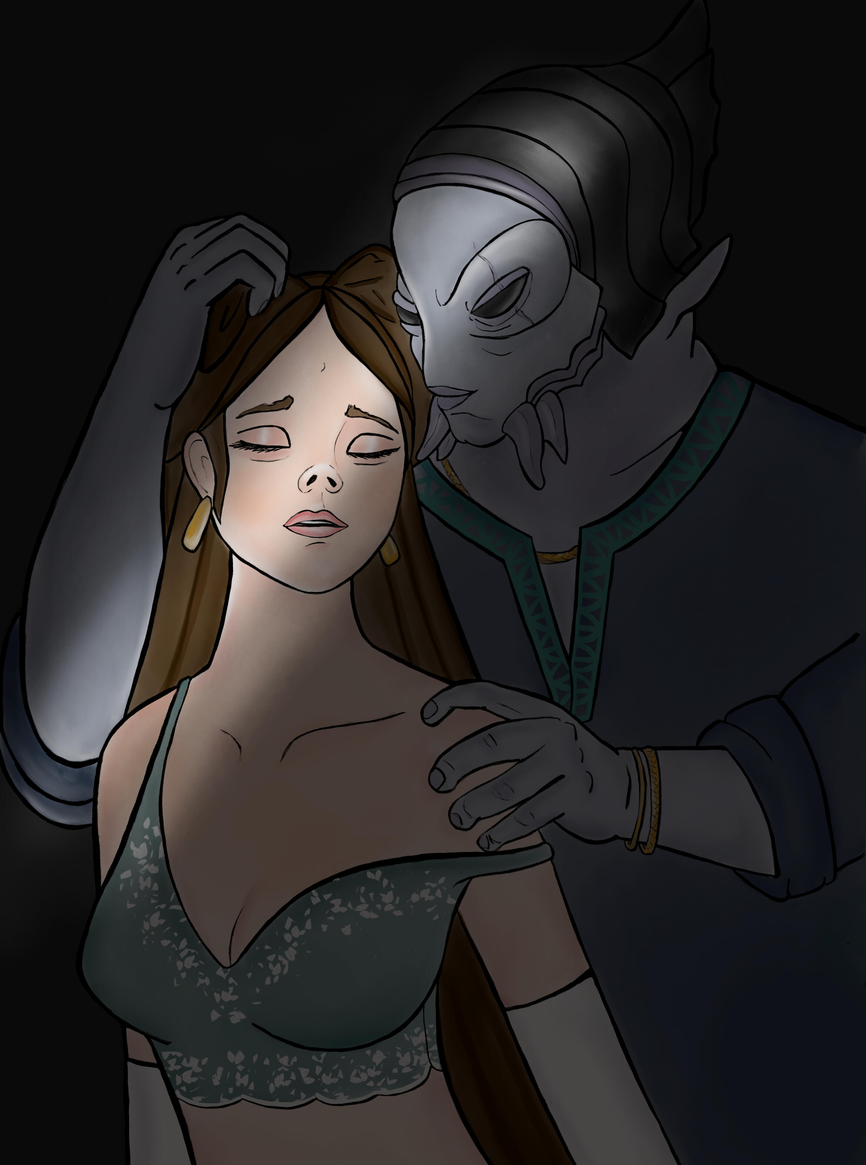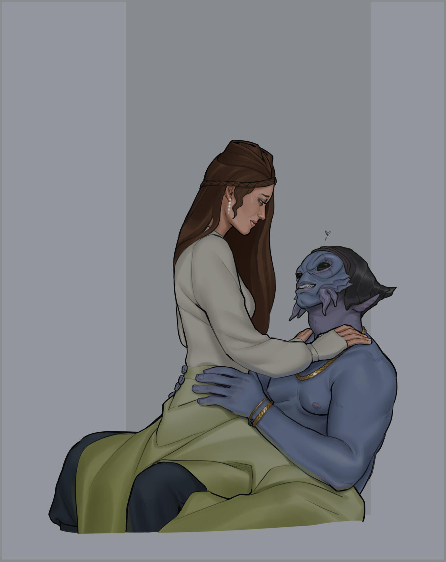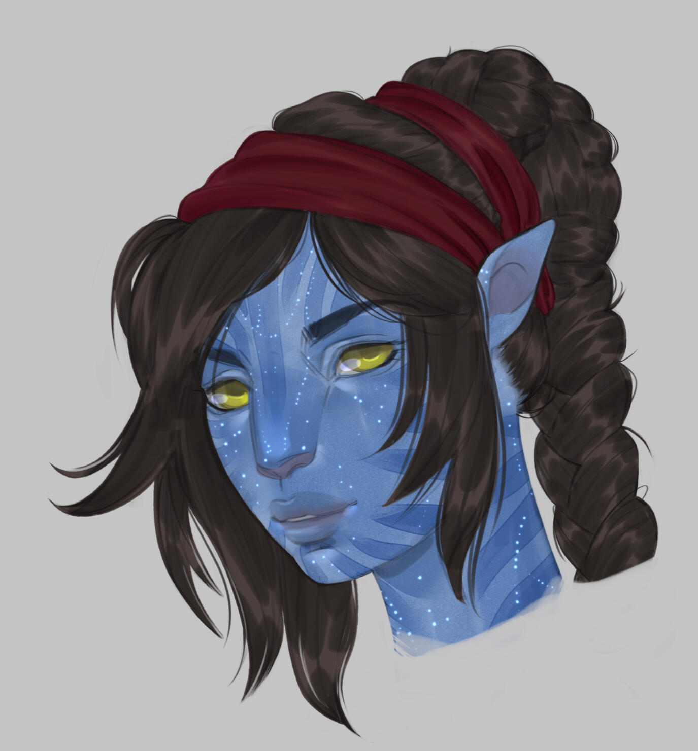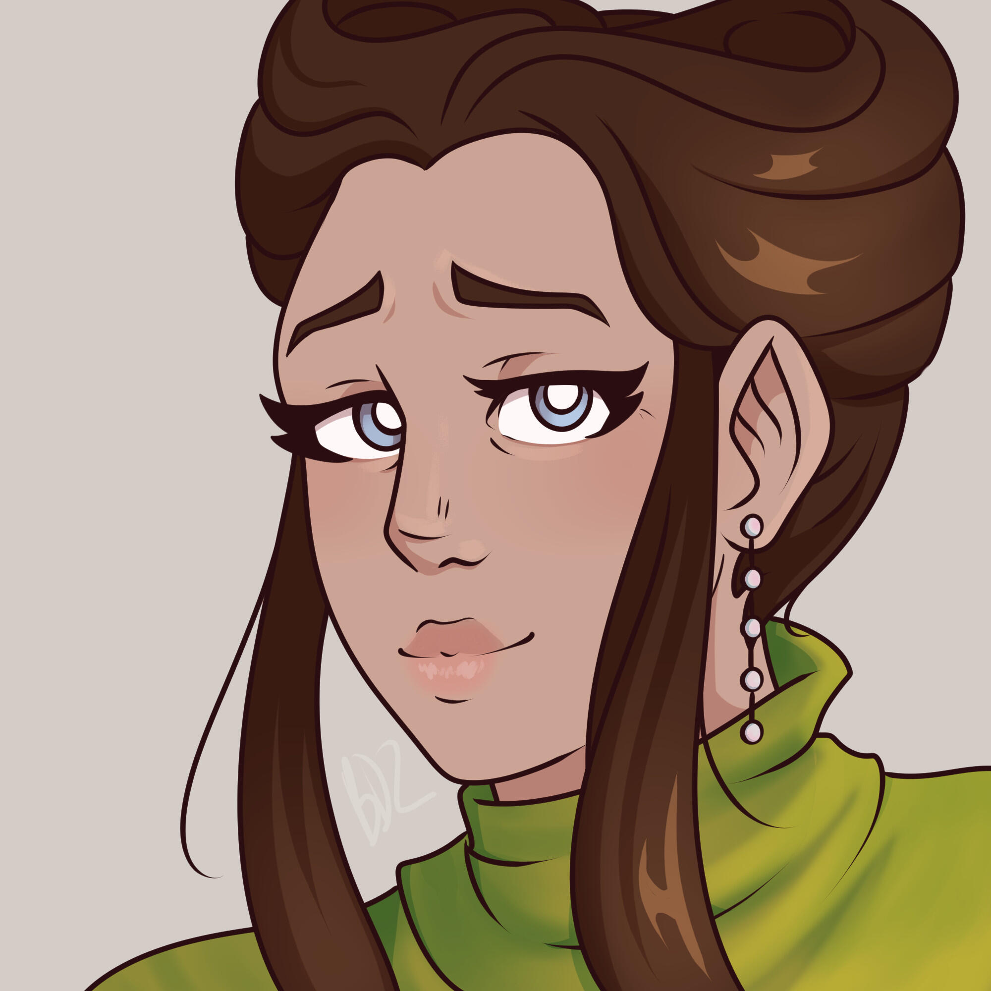 HAIR/STYLE :: Naturally dark brown, slightly wavy, and long, hitting her lower back as is customary for (an unmarried) Aargauun elite lady. Often it's braided and partially or fully pinned up (the latter usually for her job).