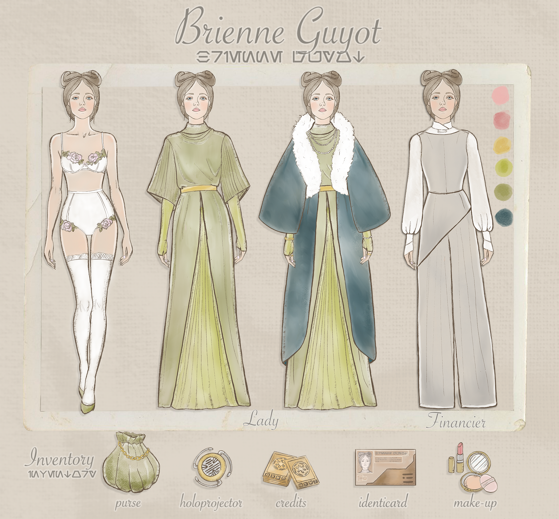 Brienne Guyot was born into the Guyot and Landry Banking Dynasties of Aargau as the only child of a short-lived union. Wealthy and privileged, you want for nothing. With family politics making arranged marriage difficult, she decided to put her elite education in finance to use and pursue a career. In 22 BBY, nepotistic connections secured Brienne a position as a bank representative at the Coruscant branch office of the Bank of Aargau. Moving to Coruscant alone, you want to prove something to yourself and your family.After the Clone Wars, favorable connections aided Brienne in establishing a position as a financial analyst in the new government. You see potential in promotion. You work harder. In the Imperial Finance Ministry, she ladder-climbed up and out of gridline cubicles to the role of funding manager, overseeing accounts for some of the Empire's shipbuilding campaigns with Kuat Drive Yards and Sienar Fleet Systems. Her primary tasks are ensuring that secured funds are allocated efficiently and effectively to support the ministry's goals and budget. This includes occasional travel off Coruscant to places in the Core and Mid Rim to audit the shipbuilders under contract. You welcome the travel, but you begin to question your purpose in the endless spreadsheets and stress of Imperial surveillance.Outside of work, Brienne often volunteers as a pro bono financial consultant for charities and occasionally attends galas to dutifully uphold the Guyot family tradition of philanthropy. More work, even if it feels important. The routines, overfull schedules, the chronometer never stops; every day is the same. You are your job. Once, you wanted more than a career. You've forgotten. Now you're 40 and afraid of change. Another quarter passes, and she neglected using her PTO to book a trip to that beach resort on Spira like she said she would. Her terrace garden also needs tending. Slow down, Brienne. The Empire doesn't need you, but you need yourself.