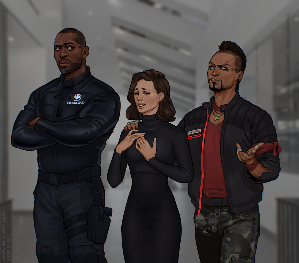 • Following Saburo Arasaka’s murder, Brienne vows allegiance and follows the orders given to her by the new CEO, Yorinobu Arasaka. With close ties to Saburo, the conservative Landry family claims membership in the Kiji Faction. It follows that Brienne does also. The internal conflict between the corp's three factions sets the director ill at ease, especially with Yorinobu's Taka faction asserting more control.• Internal pressures, suspicion of corp reorganization, and extortion by the NC gang, Los Piratas, further spiral the director into neurostim use to stay calm and carry on. Meanwhile, the suspicious death of her father, COO of Arasaka Bank, ECC, threatens this equilibrium. A private investigation points to more covert faction positioning and heightens her concerns about an internal war. She gets caught searching files that were revoked from her access. This leads to dismissal from the corp and her being hunted down by Arasaka agents sent by Yorinobu. The gang's protection racket becomes her savior.